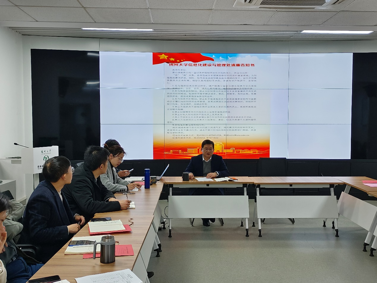 3月29日下午,信息化处党支部召开支部党员大会,党支部书记、处长秦宏伟主持会议。会议总结了2022年支部工作,部署今年工作,传达学校2023年全面从严治党会议精神以及机关党委2023年工作要点,组织签订党风廉政建设责任书,并公开发布致合作单位的“清廉告知书”。