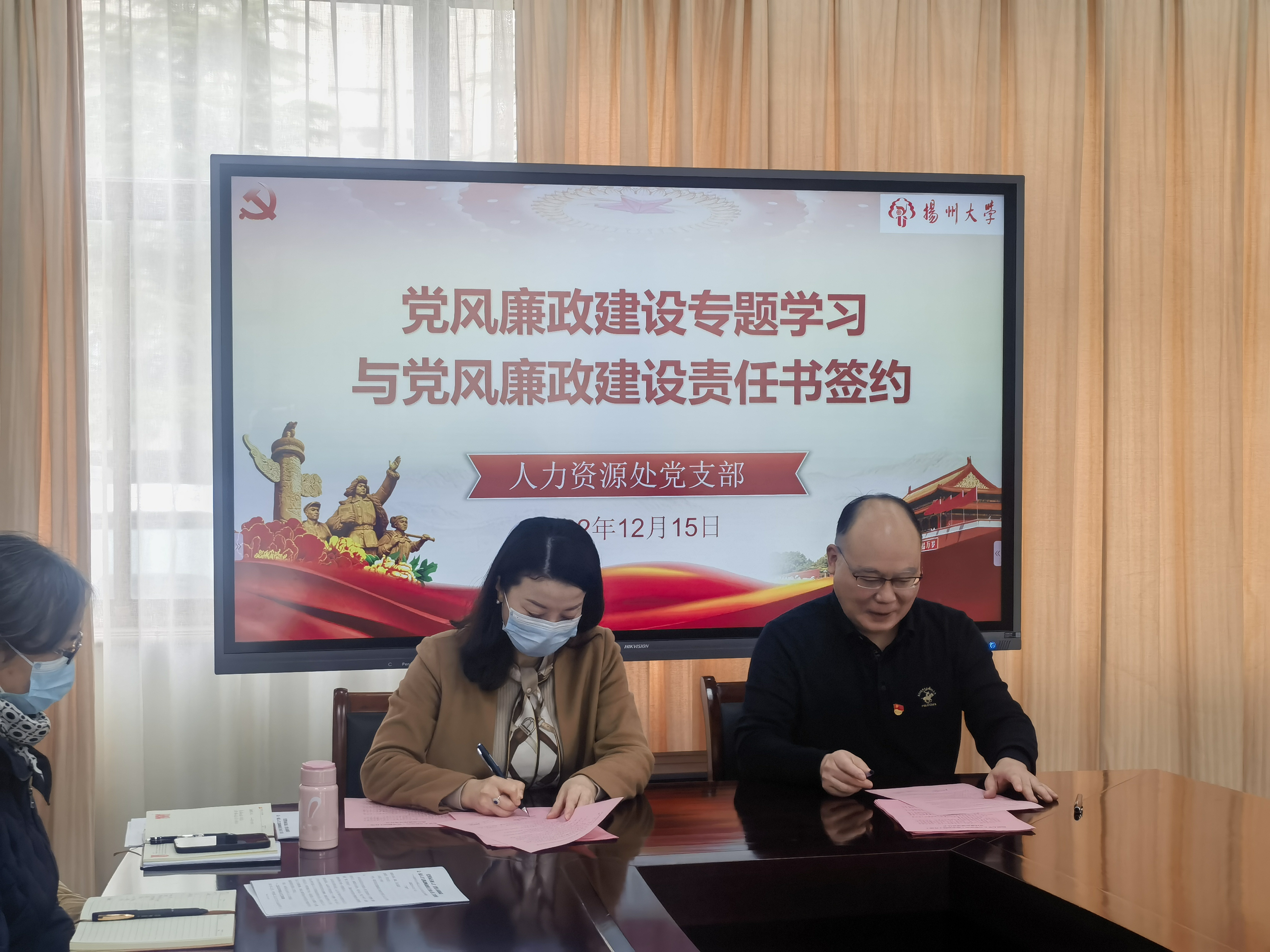 会上,支部副书记汤学俊带领全体党员学习党的二十大报告中关于党风廉政建设的相关内容,并就人事处党风廉政建设责任制网络调整事宜做了说明。随后,责任人与责任对象分别签订了《扬州大学人力资源处党风廉政建设责任书》,以“军令状”的形式把党风廉政建设主体责任落到实处。