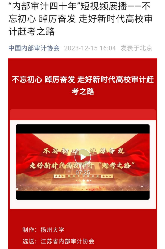 12月15日,中国内部审计协会公布了“新中国内部审计四十年”作品展播名单,审计处党支部申报的短视频《不忘初心 踔厉奋发 走好新时代高校审计赶考之路》成功入选。